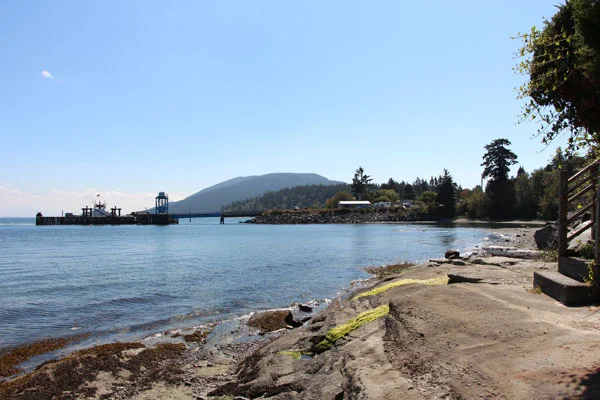 /Once the Lummi Island ferry landing, this county park has an observation deck for watching the ferry cross below views of Mount Baker. There is stairway access to tidelands below.